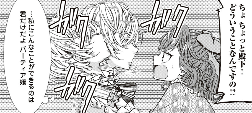 断罪の、いわゆるザマァされる時期が目前に迫ってくると、バーティアはだんだんとセシルを避けるようになったり、セシルから婚約破棄されること前提で話をすることが多くなるんですけど、それがもうセシルには我慢ならなくて、イラついてイラついて、しまいにはバーティアに八つ当たりするようになってしまったりします。